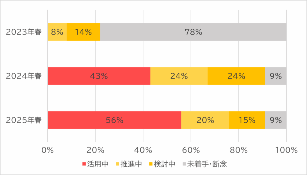 生成AIは今や、日々の生活や業務に欠かせないツールとなってきました。PwC Japanグループの「生成AIに関する実態調査2025春 5カ国比較」によると、日本国内の企業のうち56%が生成AIを社内に導入しており、2024年の調査から増加し、ついに過半数を超えました。